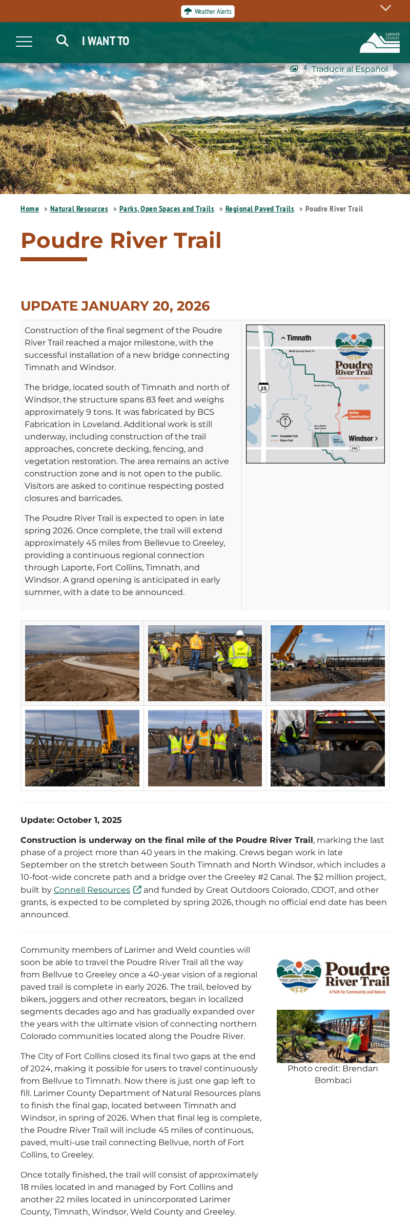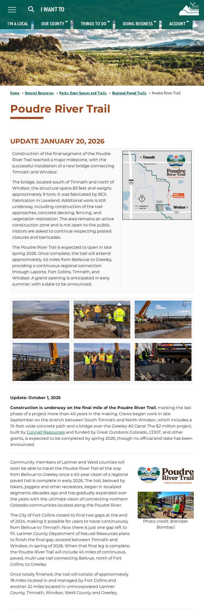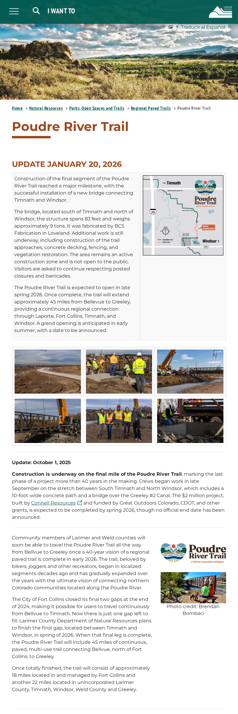 As of the Oct 1, 2025 update on the page, construction is underway on the final mile of the Poudre River Trail between South Timnath and North Windsor, leaving one gap to fill. The project is expected to be completed in spring 2026, so the full trail from Bellvue to Greeley is not yet complete including the Timnath–Windsor section.