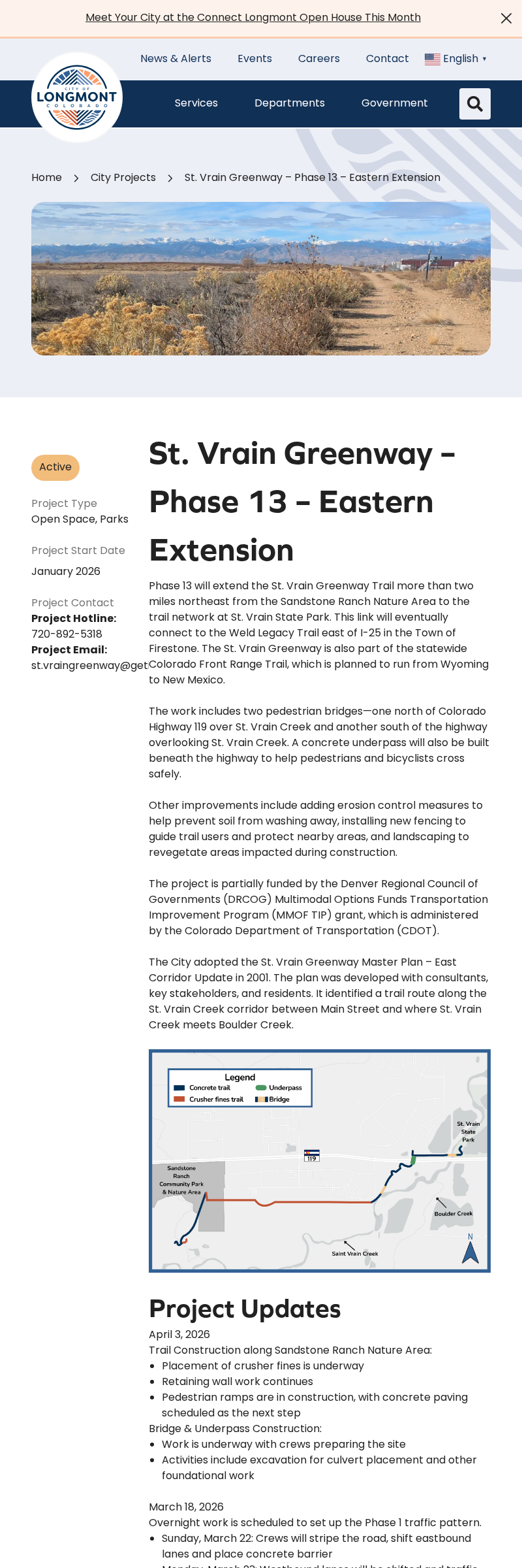 The page shows the project as Active with a construction schedule from January 2026 to spring 2027. Project updates (April 3, 2026; March 2026) describe ongoing work (crusher fines, ramps, underpass construction) and closures (dirt trail access closed through late April). There is no indication that construction is finished or that the entire trail is fully open.