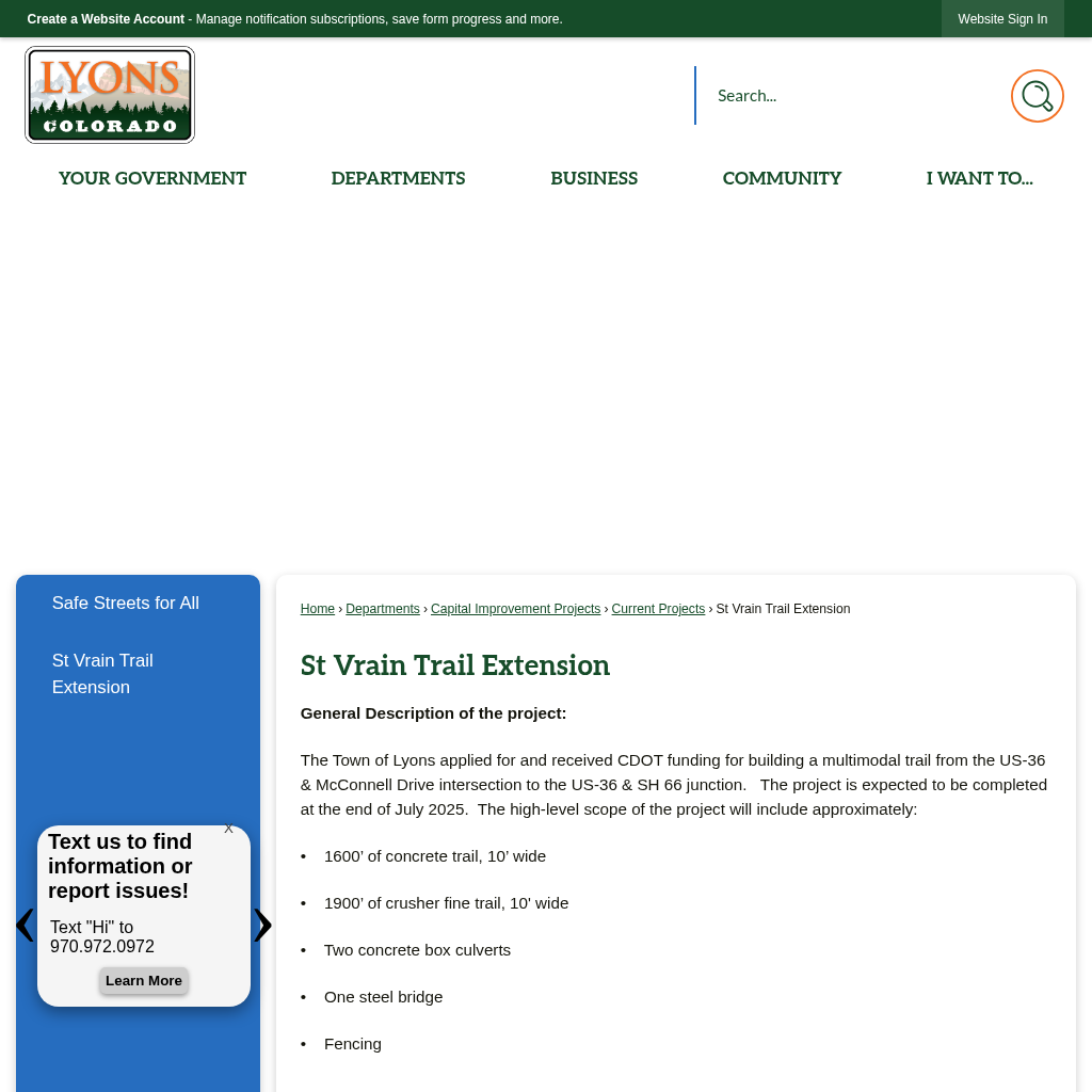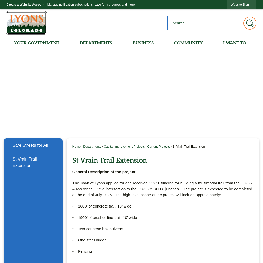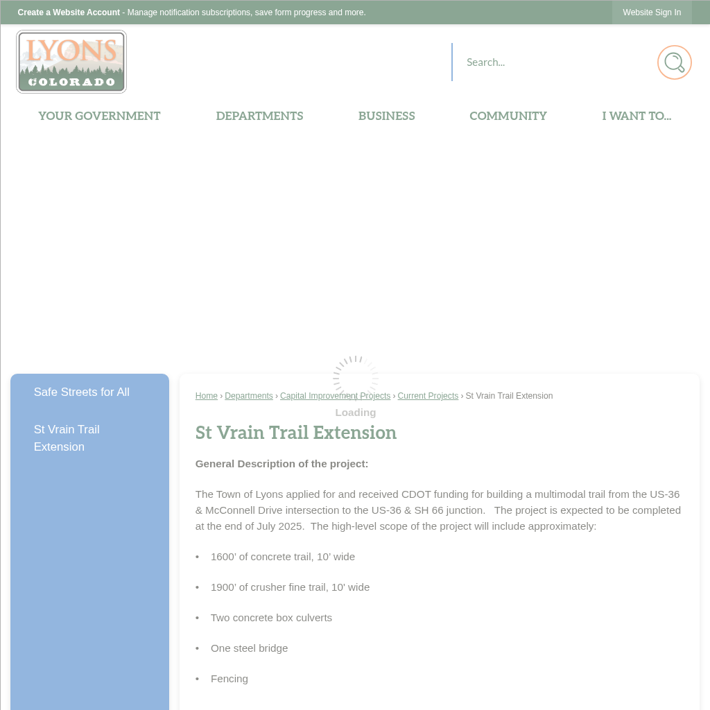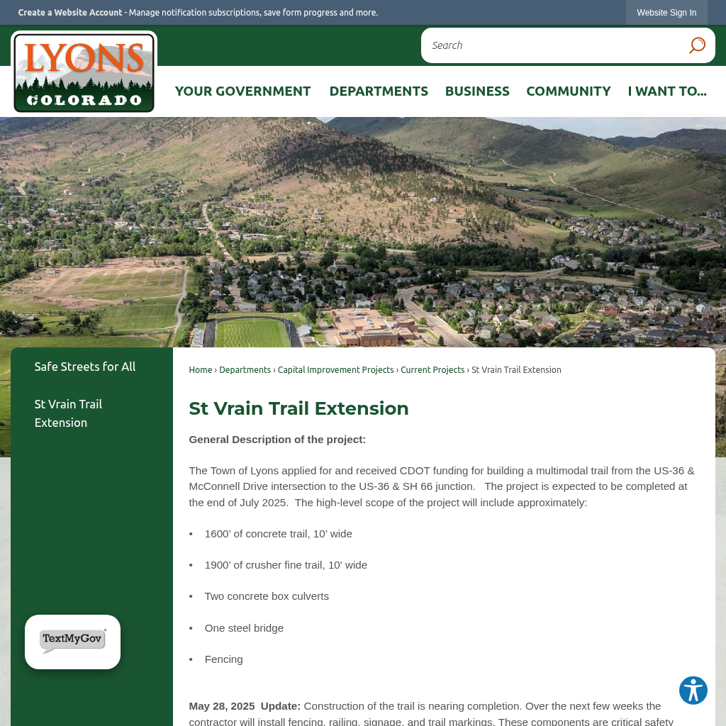 The webpage indicates that the St Vrain Trail extension project is "expected to be completed at the end of July 2025" and describes ongoing construction activities such as concrete and crusher fine trails, culverts, a steel bridge, and fencing. There is no mention that construction is finished or that the trail is fully open; it only states the project is nearing completion, with an expected finish date in the future. Therefore, the trail is not yet fully open.