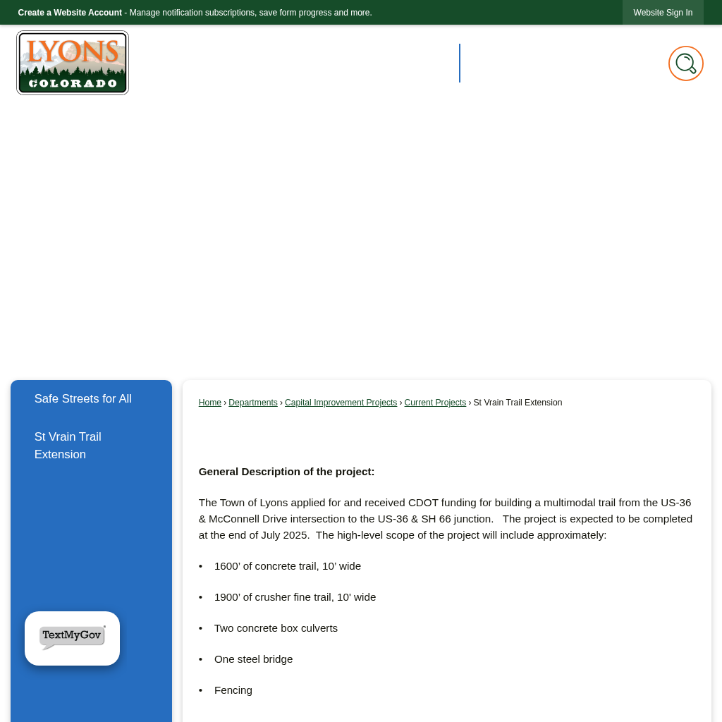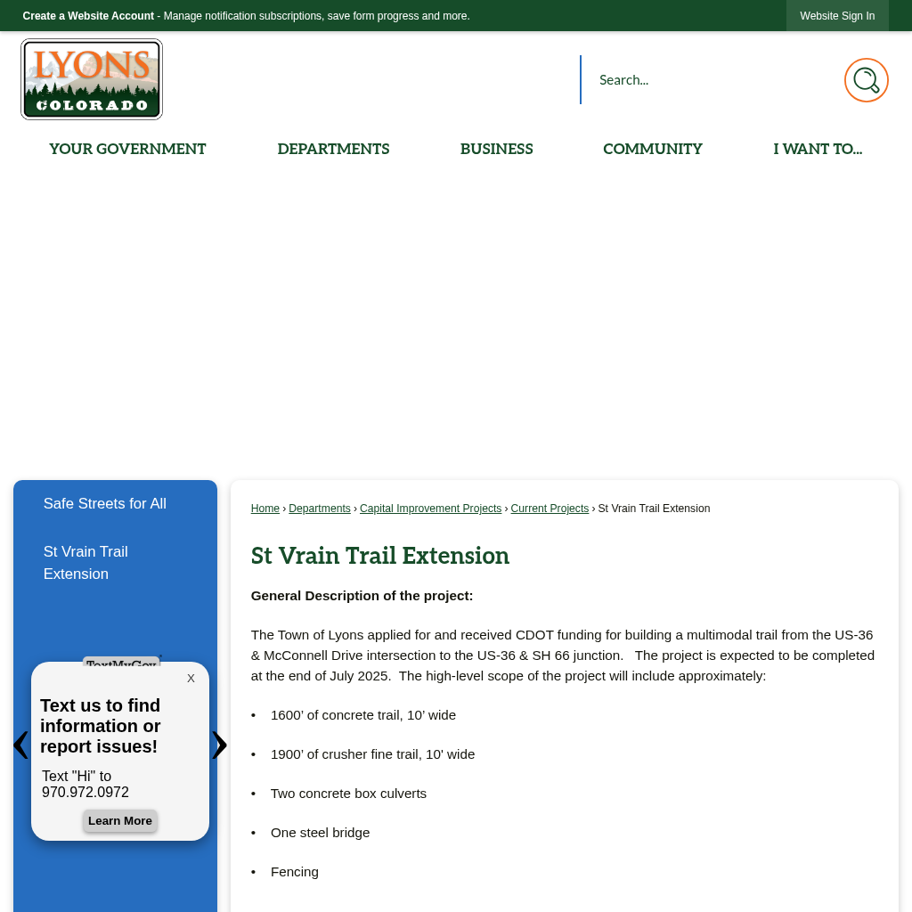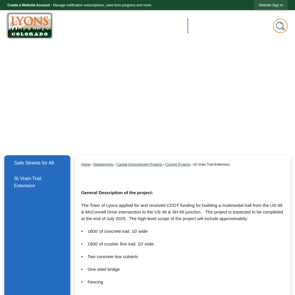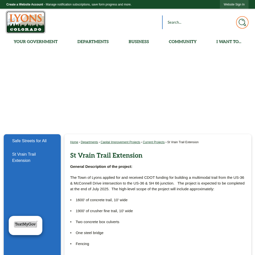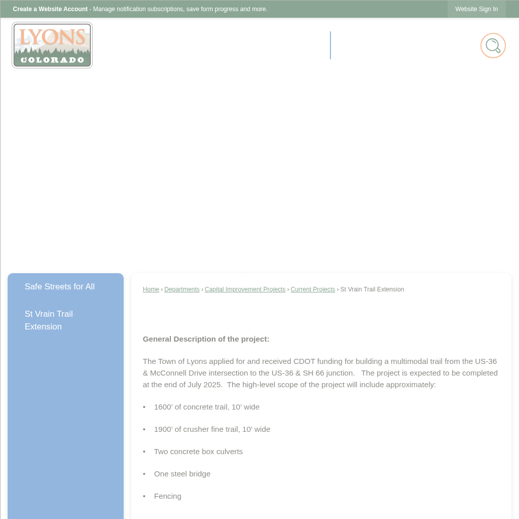 The webpage indicates that the St Vrain Trail extension project is "expected to be completed at the end of July 2025" and describes ongoing construction activities such as concrete and crusher fine trails, culverts, a steel bridge, and fencing. There is no mention that construction is finished or that the trail is fully open; it only states the project is nearing completion, with an expected finish date in the future. Therefore, the trail is not yet fully open.