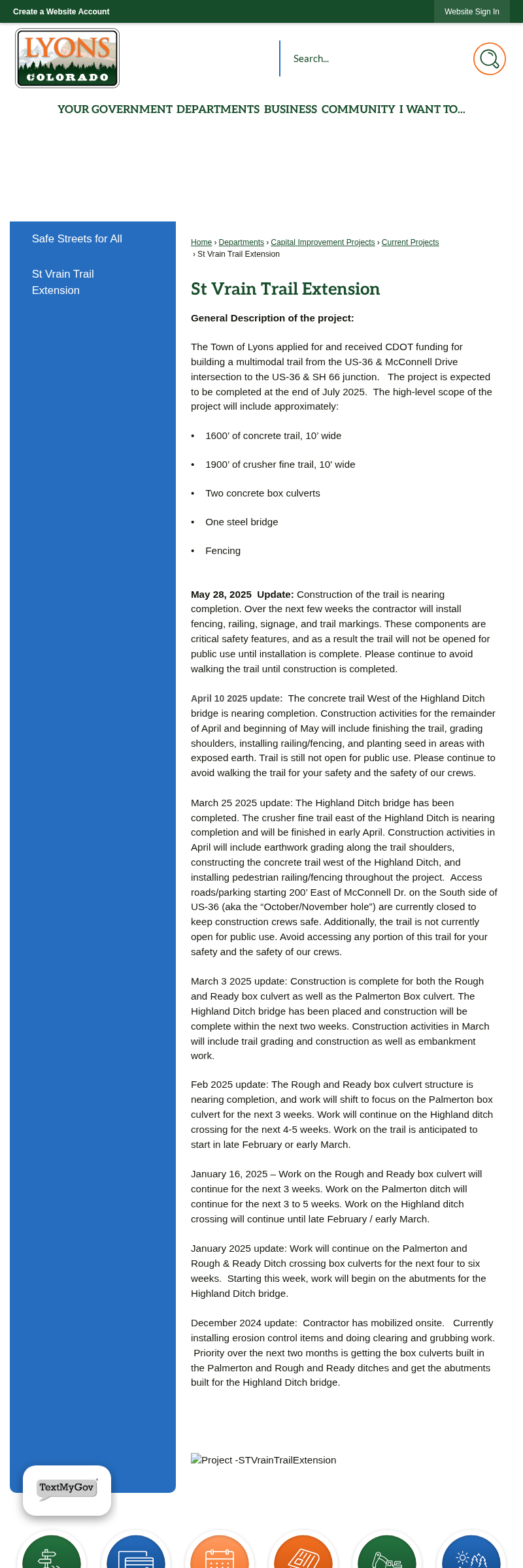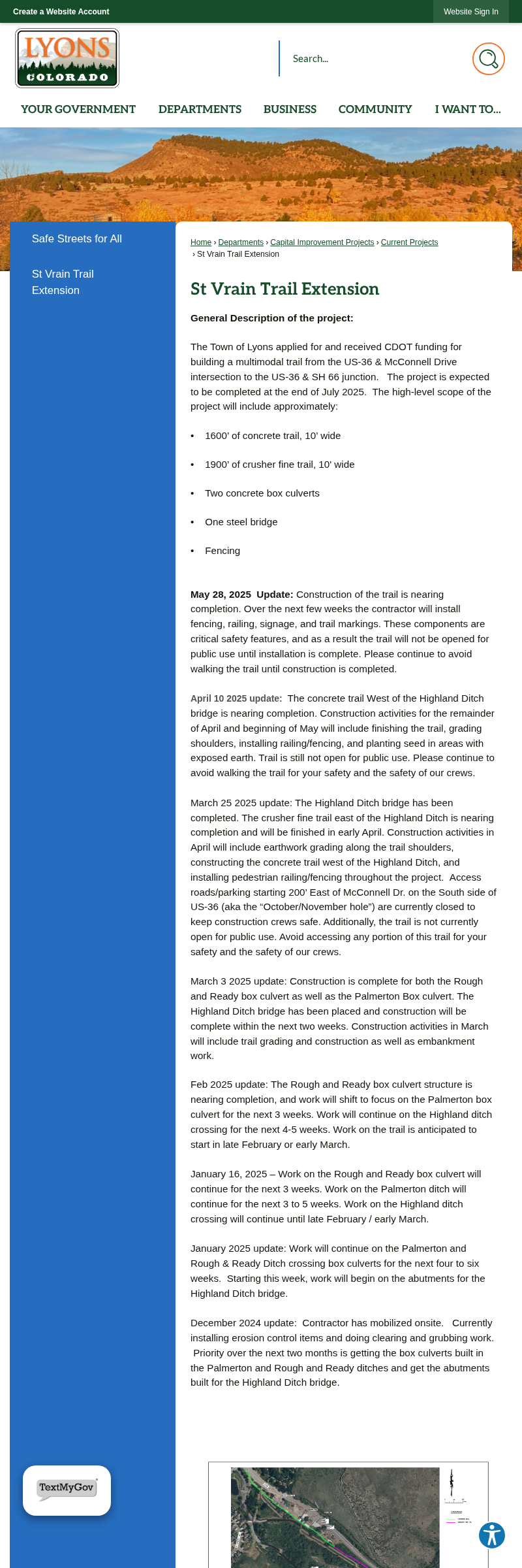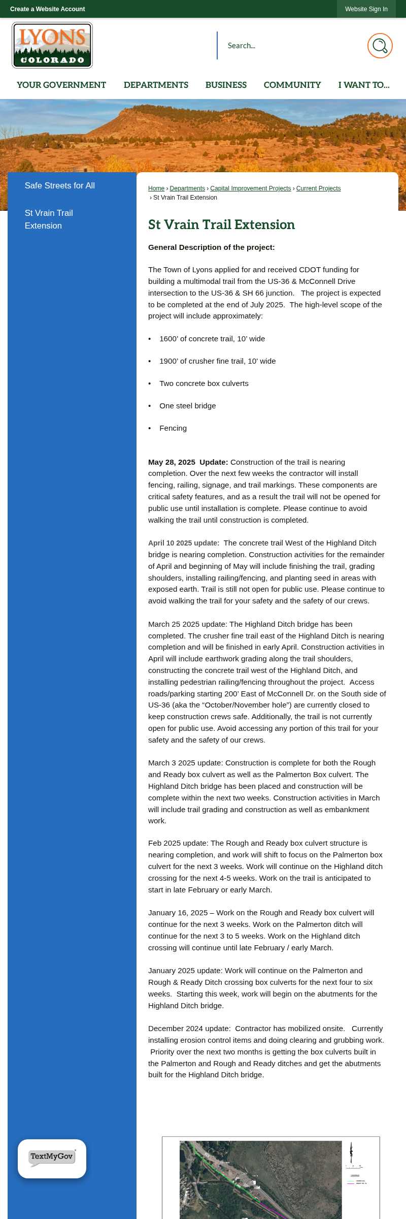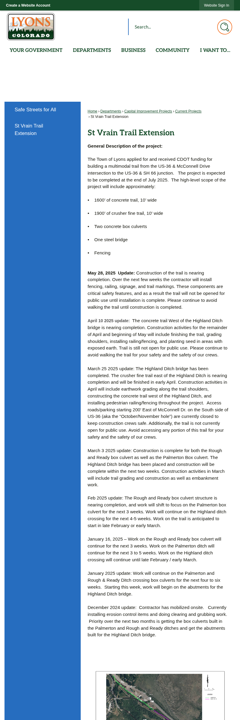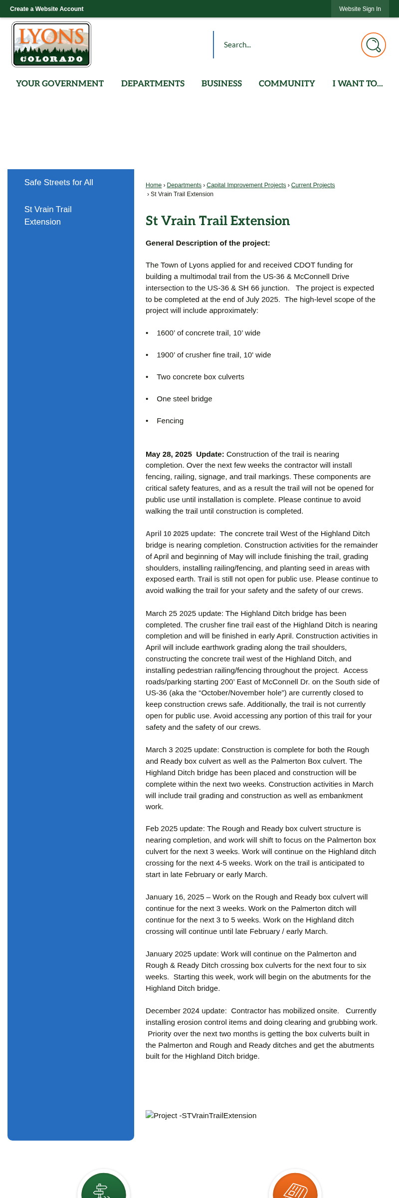 The webpage provides updates on the construction of the St Vrain Trail Extension. The most recent update is from May 28, 2025, which states that construction is nearing completion but the trail is not yet open to the public. The update mentions that critical safety features such as fencing, railing, signage, and trail markings are still being installed. Previous updates indicate that various sections of the trail and related structures (like bridges and culverts) are nearing completion or have been completed, but the trail remains closed until all safety features are installed.