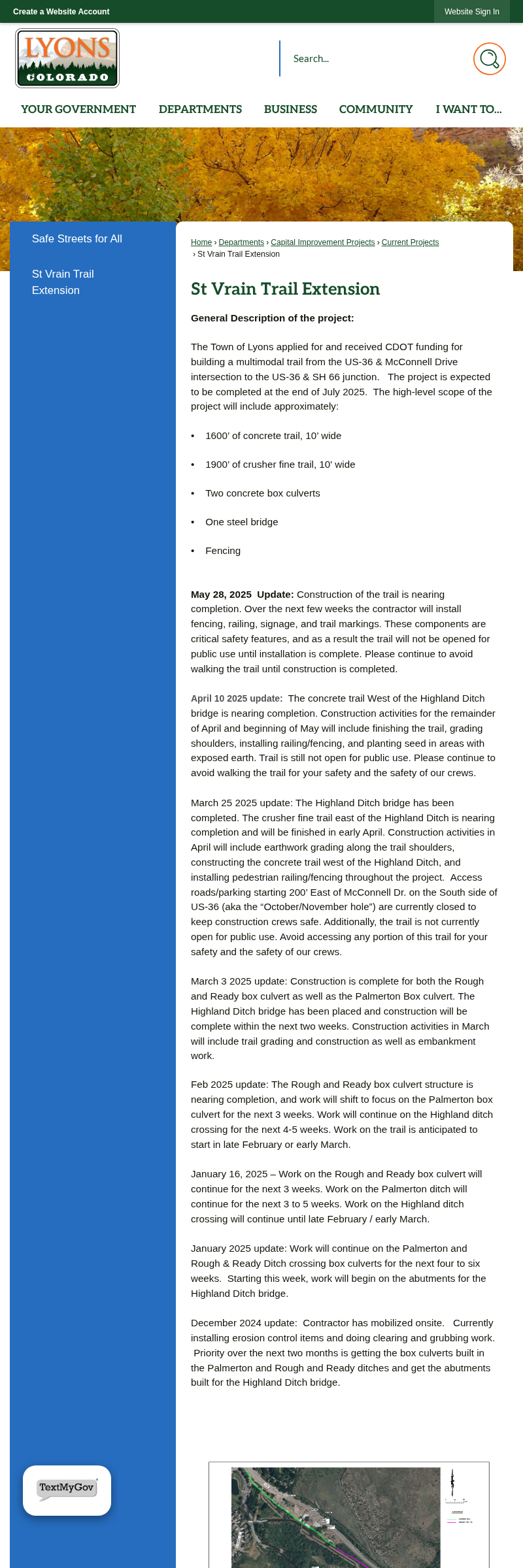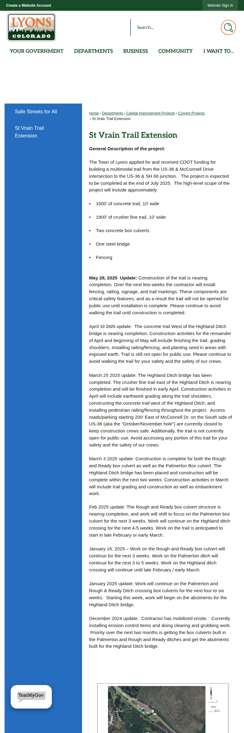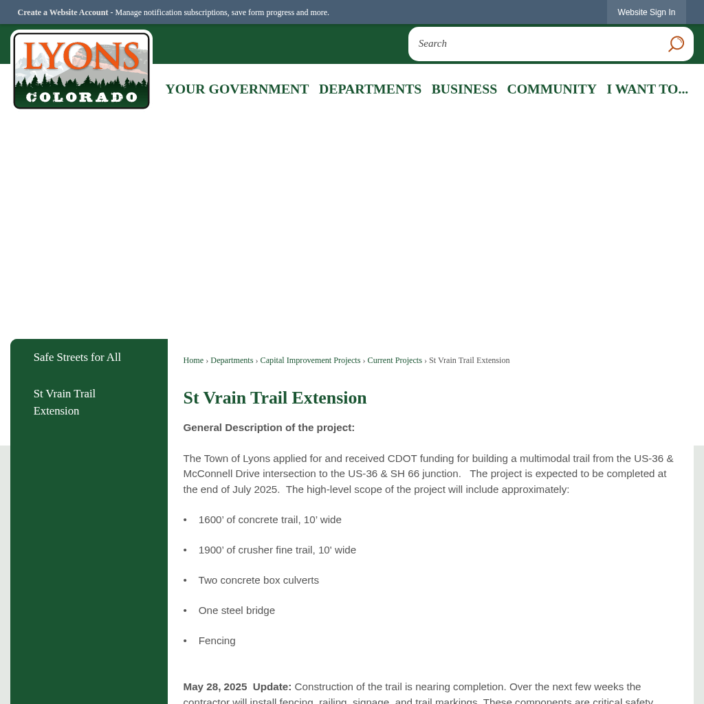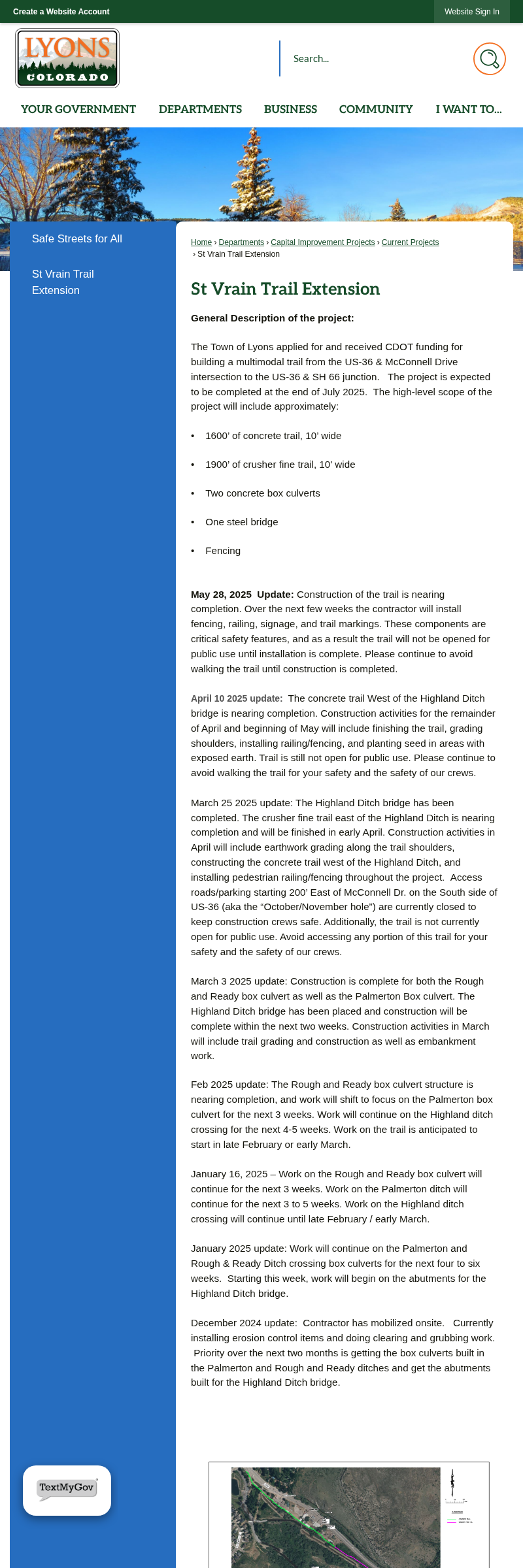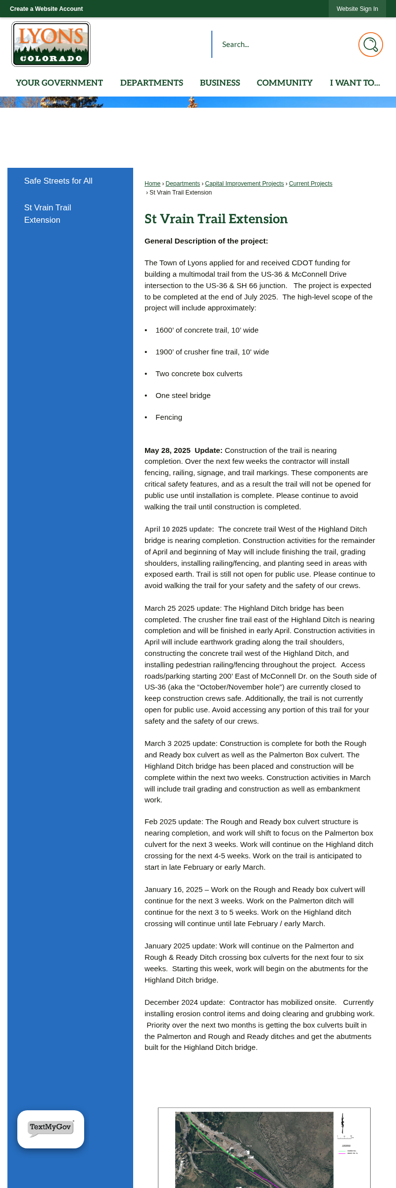 The webpage provides updates on the construction of the St Vrain Trail Extension. The most recent update is from May 28, 2025, which states that construction is nearing completion but the trail is not yet open to the public. The update mentions that critical safety features such as fencing, railing, signage, and trail markings are still being installed. Previous updates indicate that various sections of the trail and related structures (like bridges and culverts) are nearing completion or have been completed, but the trail remains closed until all safety features are installed.