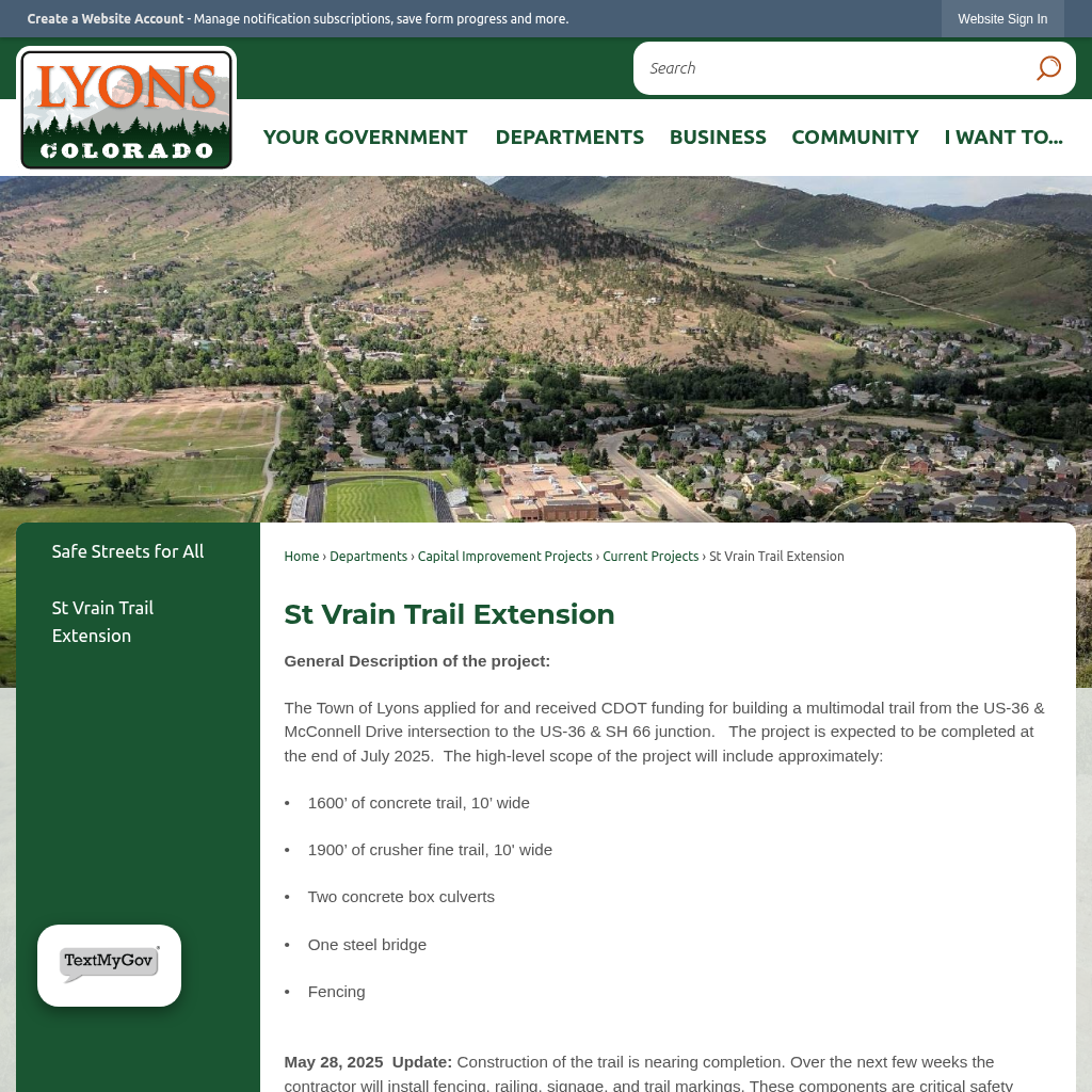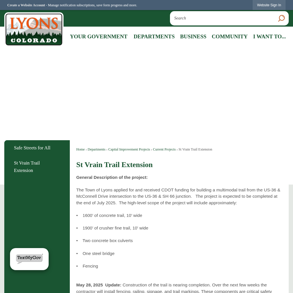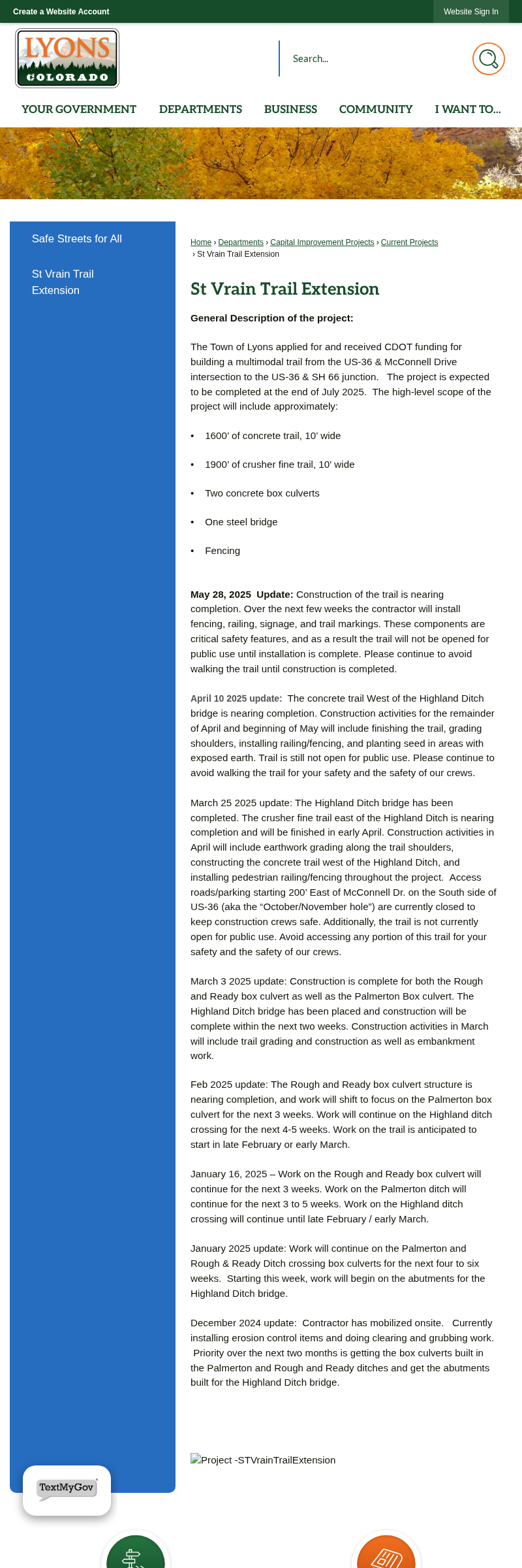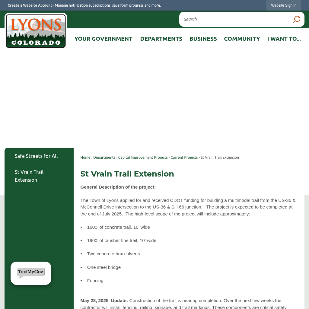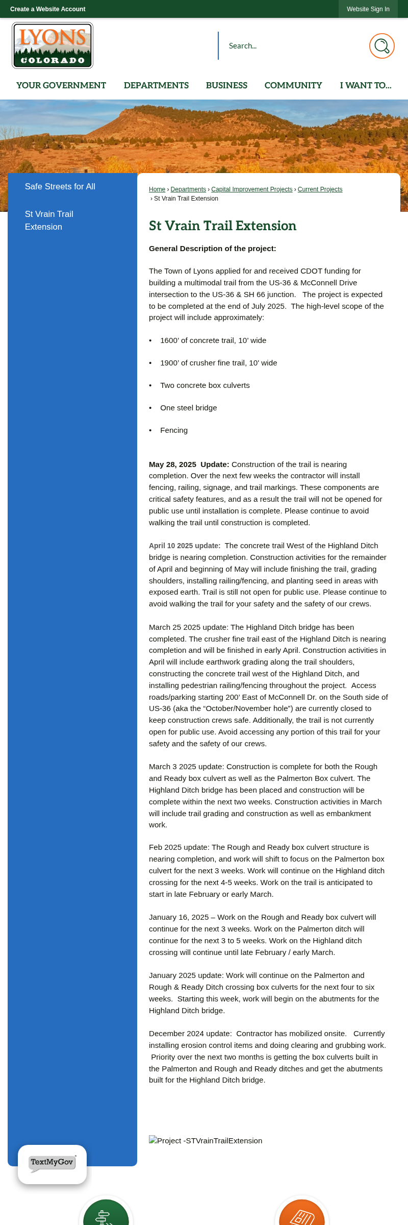 The webpage provides updates on the construction of the St Vrain Trail Extension. The most recent update is from May 28, 2025, which states that construction is nearing completion but the trail is not yet open to the public. The update mentions that critical safety features such as fencing, railing, signage, and trail markings are still being installed. Previous updates indicate that various sections of the trail and related structures (like bridges and culverts) are nearing completion or have been completed, but the trail remains closed until all safety features are installed.