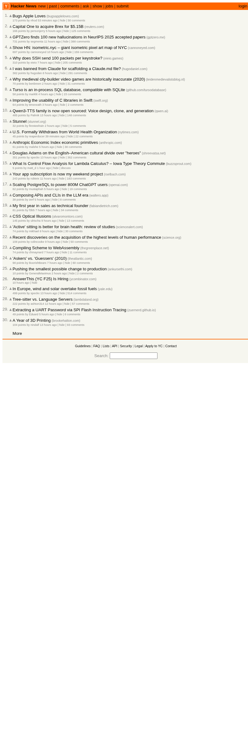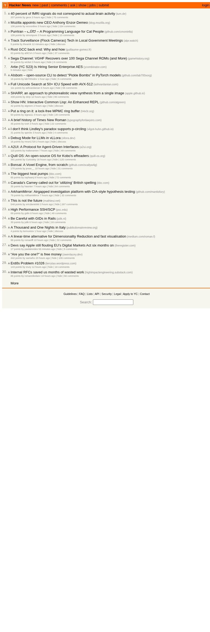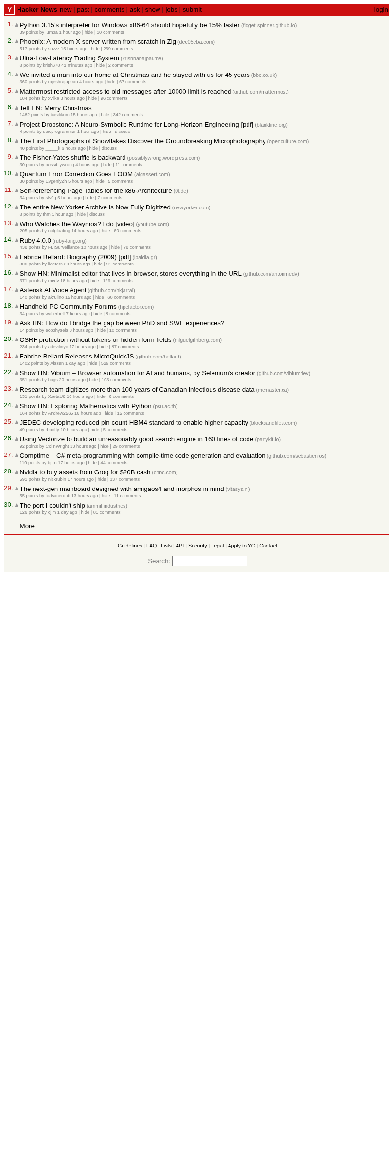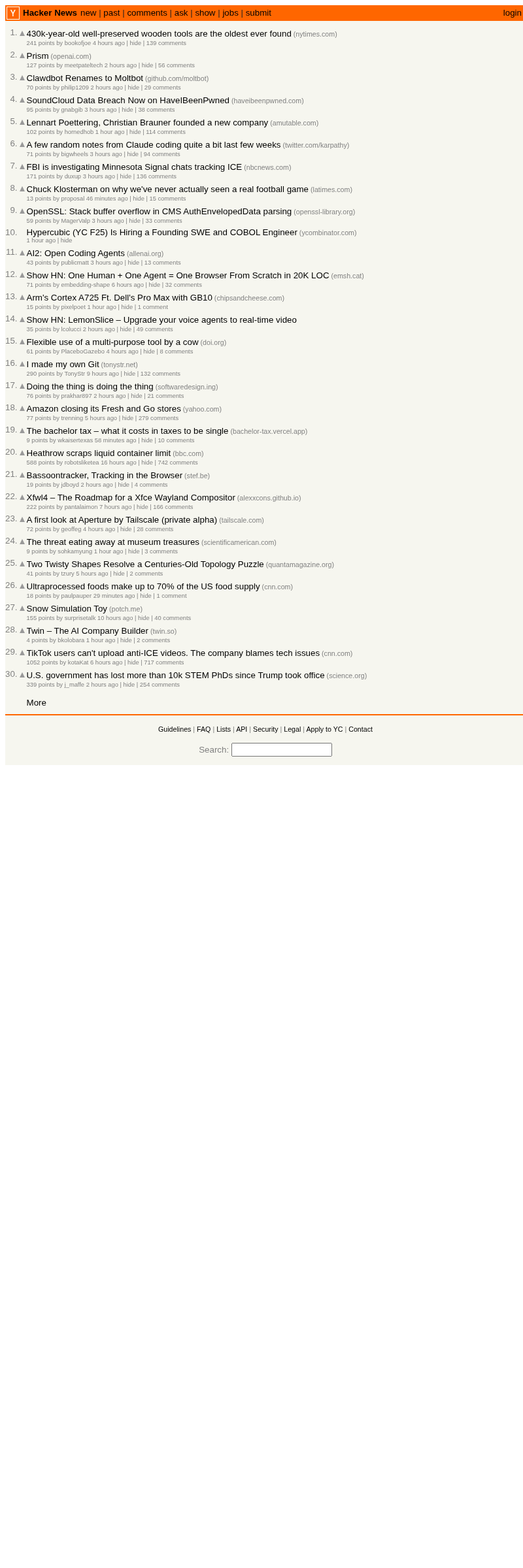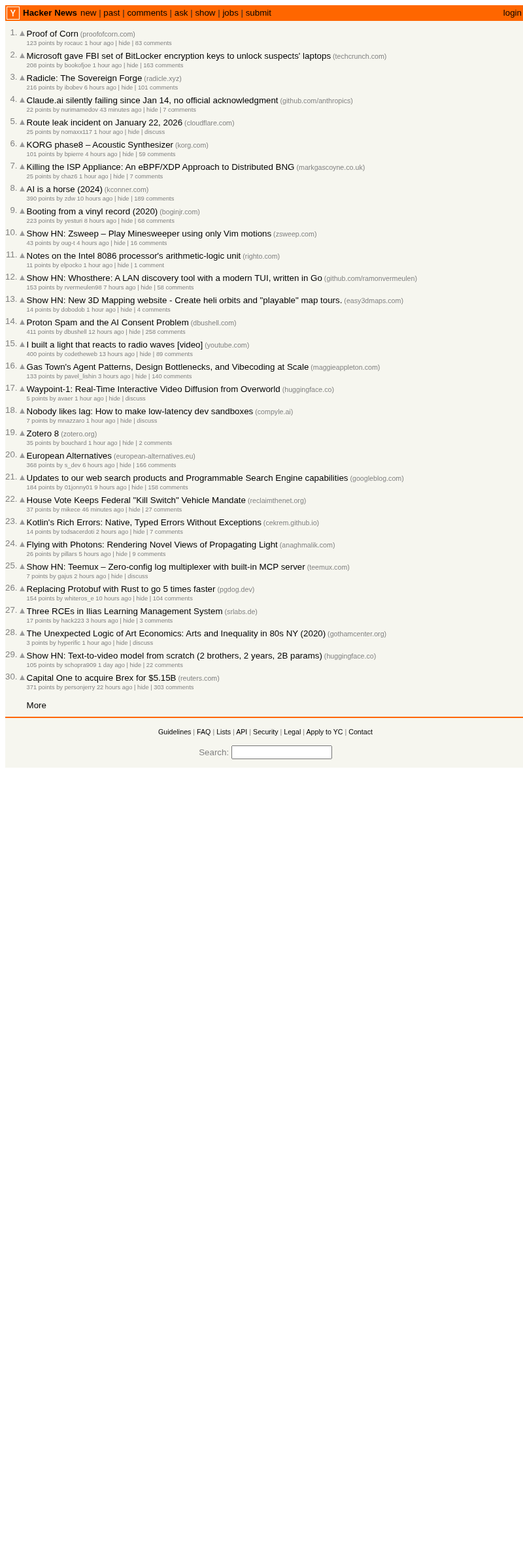 The list shows 30 Hacker News posts. I scanned the titles and domains for the term 'brightwheel' and found no matches; none of the posts mention brightwheel.