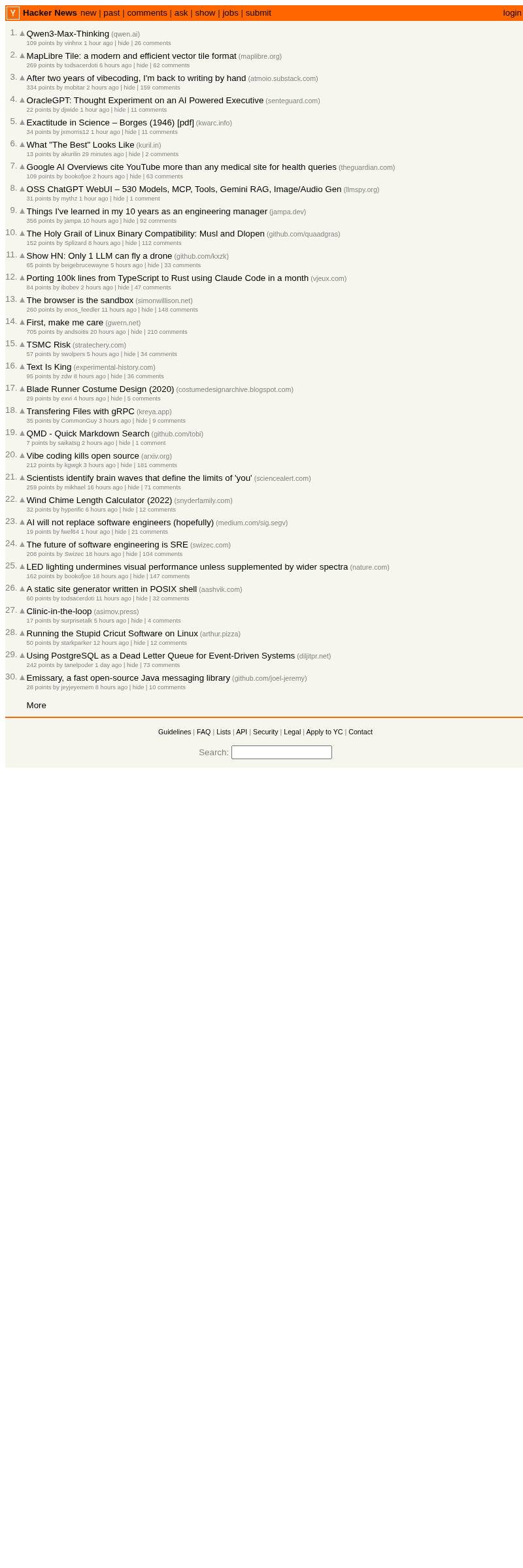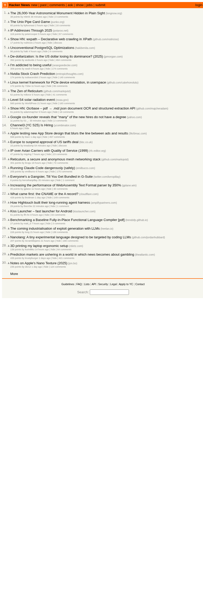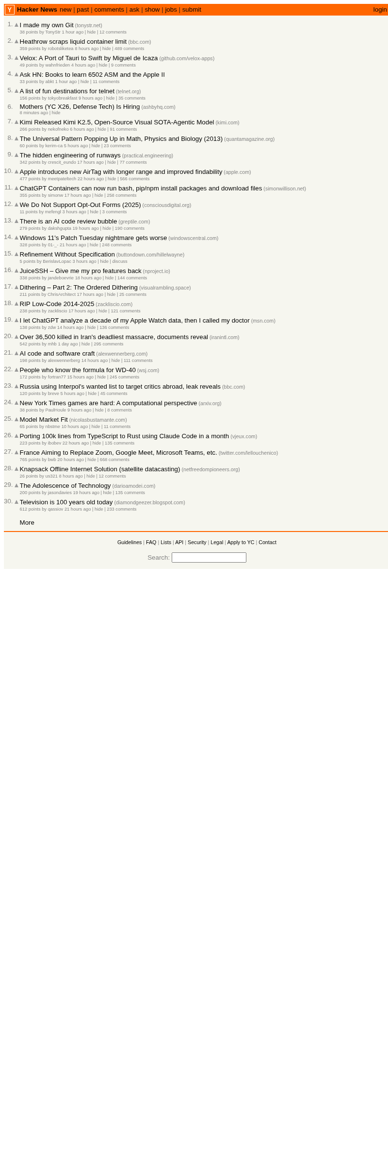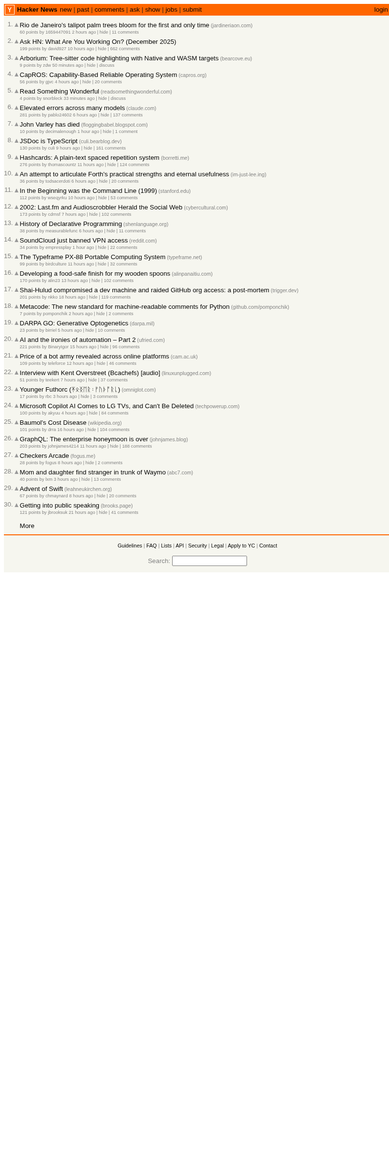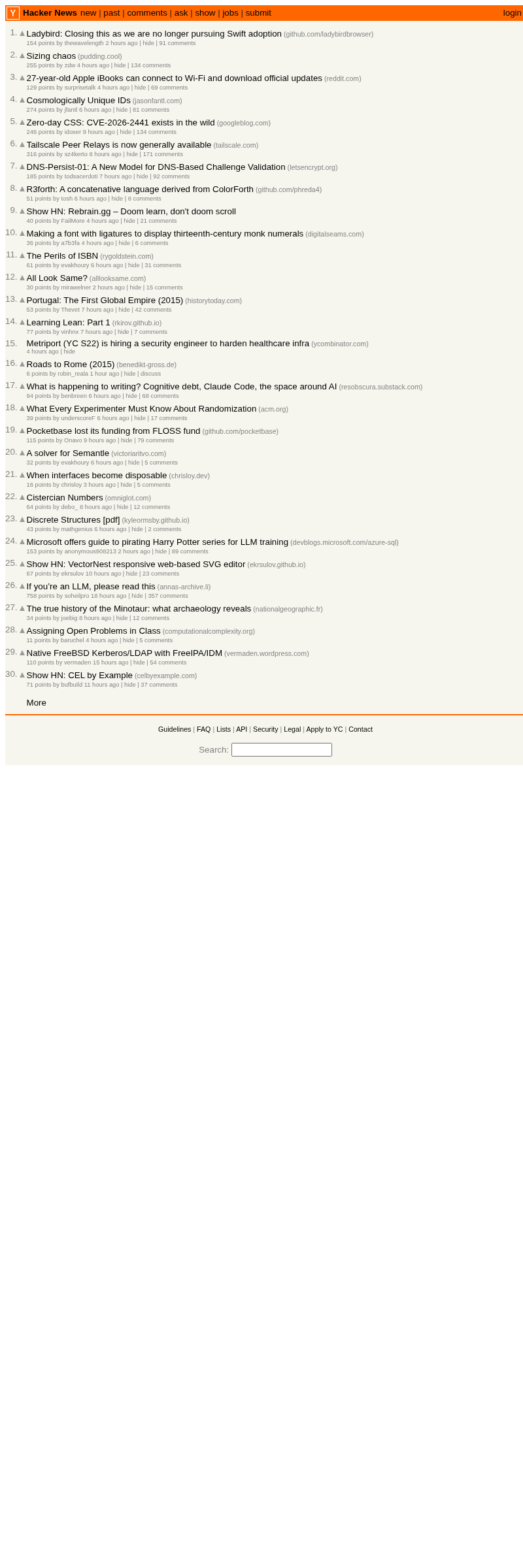 The list shows 30 Hacker News posts. I scanned the titles and domains for the term 'brightwheel' and found no matches; none of the posts mention brightwheel.