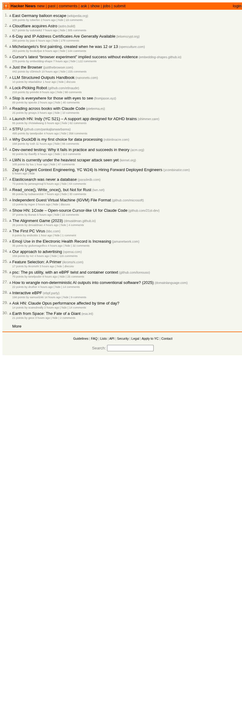 The innerText lists 30 Hacker News items. Scanning for the string 'brightwheel' yields no matches; none of the titles mention Brightwheel.